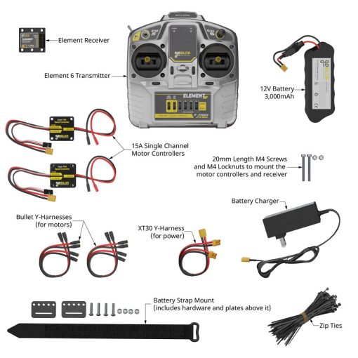 The transmitter and receiver of the tried-and-true Element-6 Radio Control System allow you to operate the two included motor controllers with ease.
